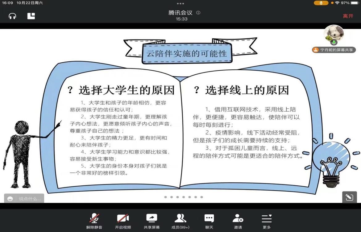 会上,主持人宁丹妮从孤困儿童的具体案例作为切入点,分析其存在问题,以专业视角讲解陪伴方案和模式,并展示往期实践活动的成效。另外,她结合自身经历向大家呈现大学生在此项项目中的自身优势,鼓励同学们参与到“云陪伴”公益活动中。