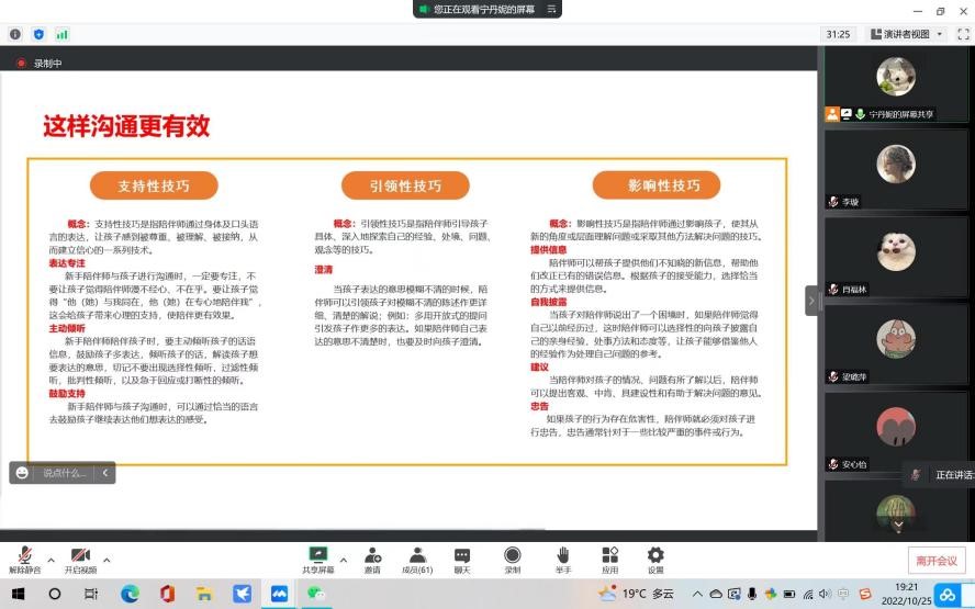 以提高孤困儿童自尊心为目标,宁丹妮建议陪伴师们从情感支持、梦想树立、学习辅导、习惯养成、人际关系等方面入手,全面提高孤困儿童的自尊水平,促进其身心的全面发展;同时也鼓励陪伴师们增进自身的知识素养、能力素养、心理素养和角色素养,提高自身的陪伴水平和陪伴能力,为孤困儿童提供更好的服务。另外,宁丹妮为陪伴师们讲解了沟通交流的原则和普遍性技巧,这对陪伴师在陪伴过程中提高陪伴效率,达成项目目标服务具有重要的作用。