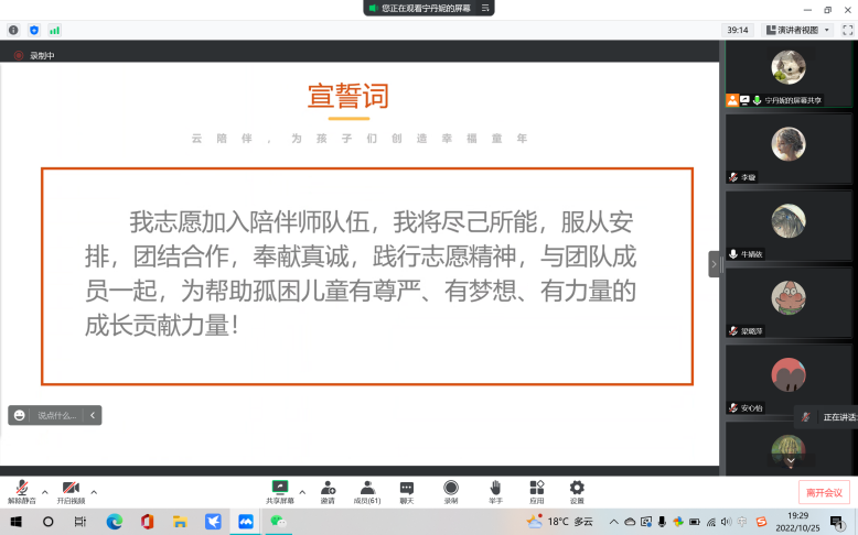 会议临近尾声,宁丹妮带领陪伴师们进行线上宣誓,宣誓词字字有声,象征着大家对于未来陪伴活动的热切希望与信心。会议结束后,工作人员将相关资料公示,许多同学表示自己会自觉进行资料的回顾与二次学习,并认为该项目与自身专业十分契合,对未来实践感到信心满满。