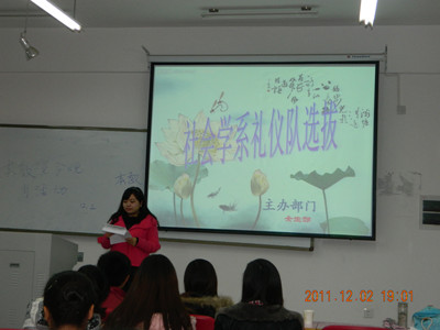 2011年12月2日晚19:00-21:00,我系女生部于2号教学楼203教室进行了为我系选拔礼仪队的活动。出席此次活动的评委是我系团总支副书记王亚琼、学生会主席杜阳、办公室主任曲颂,宣传部部长樊冰冰,女生部部长闫芬芬。