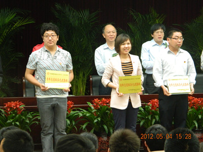 5月4日下午,我校纪念建团90周年、五四运动93周年暨2012年共青团工作表彰大会在新校区一号楼219举行。党委书记杨健燕、副书记赵大蕻、副校长卫世文出席会议并为获奖者颁奖。我系党总支副书记刘英杰、辅导员闫方方、团总支副书记王亚琼等学生代表参加表彰大会。