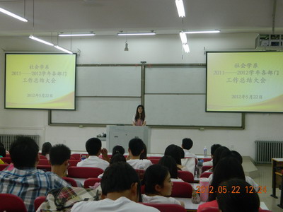 王亚琼宣布总结大会正式开始。第一,各部门代表向大家展示2011—2012学年部门工作成果,带领大家重温本学年本部门组织的各项活动,分享其成果及不足。第二,王亚琼做大会总结,肯定大家本学年的付出与努力,并表示我系各项工作既有机遇又有挑战,鼓励大家再接再厉。