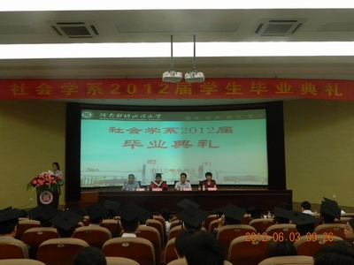 2012年6月3日上午8:30,我系在教1—219举行2012届学生毕业典礼。典礼由系党总支副书记刘英杰主持,系党总支书记王书堂、系主任王金山、副主任周林霞、社会工作教研室主任徐婕、团总支书记郝青青、辅导员闫方方及社会学系全体教职工与会,社会学系全体学生参加。