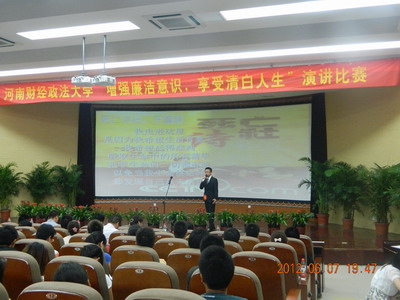 2012年6月7日晚7:00,由我校纪检委员会主办,法学院承办的以“增强廉洁意识,享受清白人生”为主题的演讲比赛决赛在我校新校区教1-219隆重拉开帷幕。我系11级社工二班的张长桥同学积极经过层层选拔进入了本次决赛。