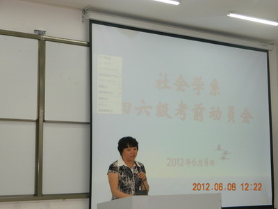 2012年6月8日中午12:10,我系四、六级考前动员会在新校区教2-220隆重召开。大会由辅导员闫方方主持。党总支副书记刘英杰,系副主任周林霞与会,社会学系全体学生参加。