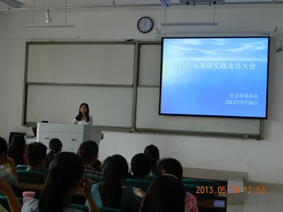 5月30日12:20,我系“2013年暑期实践活动宣讲会”在教科楼114隆重召开。我系团总支书记郝青青,辅导员闫方方以及社会学系全体学生干部及部分同学参与会议。