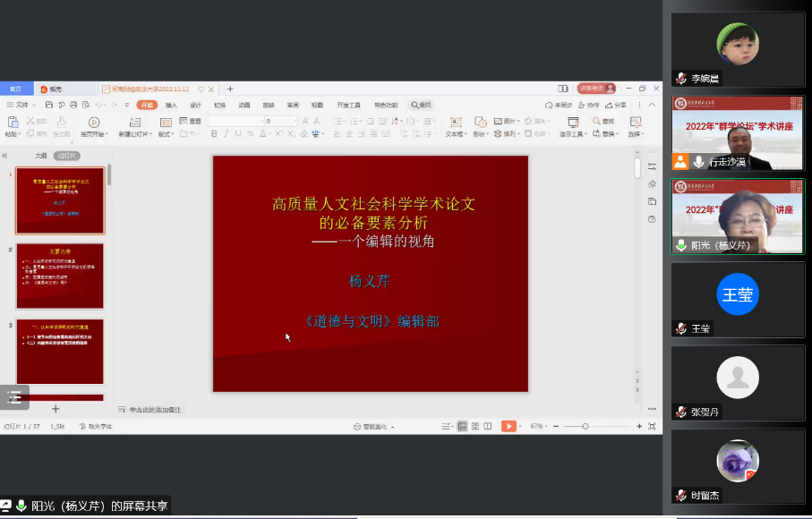 为进一步加强师生的学术素养,提高论文写作水平和质量。12月12日下午三点,永利集团3044官网欢迎您在线上举办2022年第三场“群学论坛”学术讲座。中国伦理学会会刊《道德与文明》杂志主编杨义芹研究员受邀为永利官网师生开展题为《高质量人文社会科学学术论文的必备要素分析》的讲座,永利集团3044官网欢迎您全体师生参加,讲座由永利集团3044官网欢迎您院长田训龙主持。