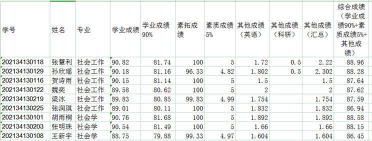 根据教育部及《永利集团3044官网欢迎您推荐优秀应届本科毕业生免试攻读硕士学位研究生工作管理办法》(河财政文〔2024〕26号)精神,以及《永利集团3044官网欢迎您推荐优秀2025届本科毕业生免试攻读硕士学位研究生遴选工作方案》,永利官网经过学生自愿申请,学院资格审核,共有9名学生在9月3日前提交了材料,经综合评定,现将社会工作专业和社会学专业的综合成绩分别排序予以公示。